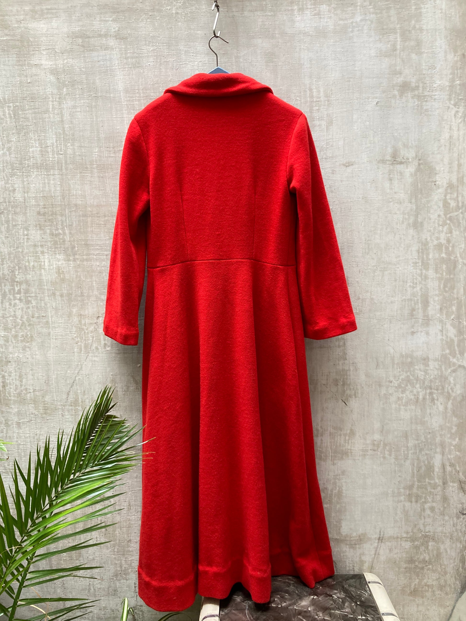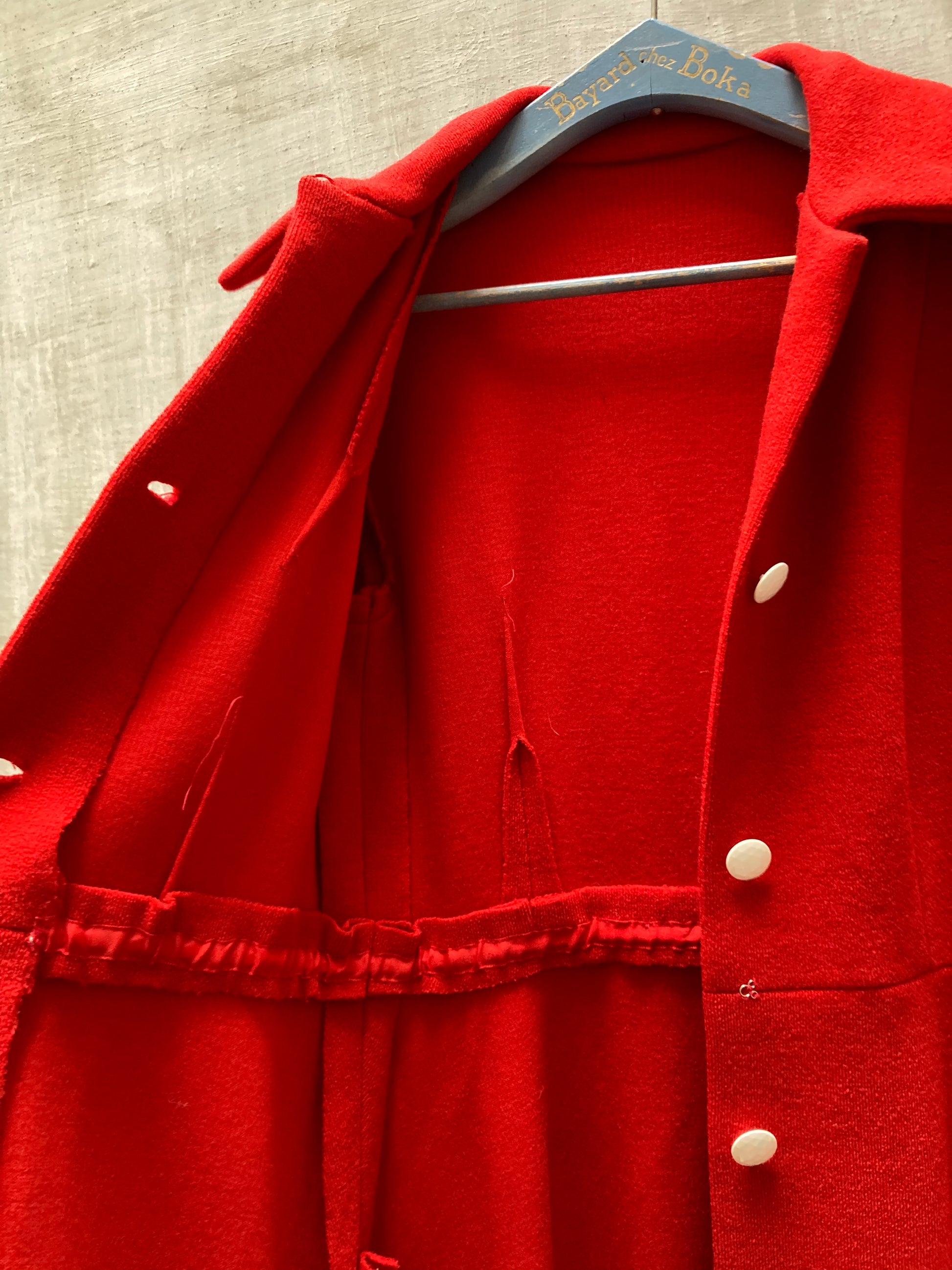 C’est une pièce unique, il n’y a pas d’étiquette et semble être confectionnée par une couturière. La coupe et la forme sont très simple et épurés mais précise et absolument bien ajustée.